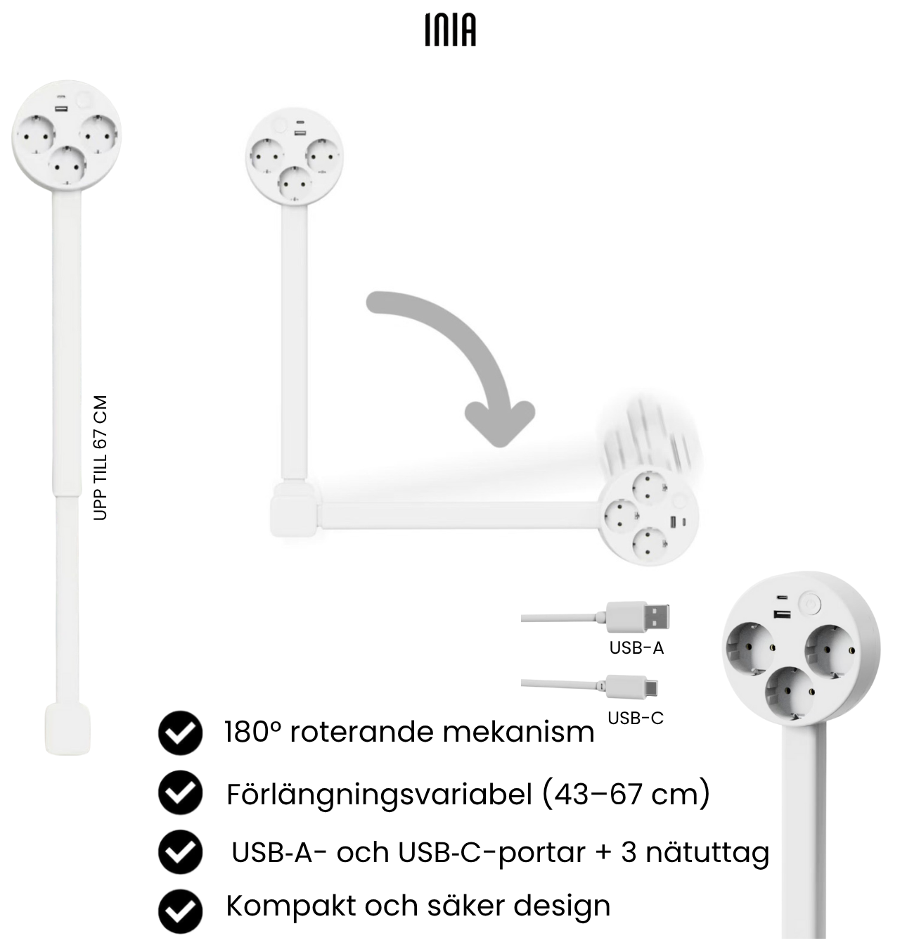 Imagine never again having to struggle with tangled cables, chargers stuck behind furniture or a lack of sockets just when you need them. INIA® is the ultimate extension cable, designed to free up space, improve safety and make everyday life much easier.