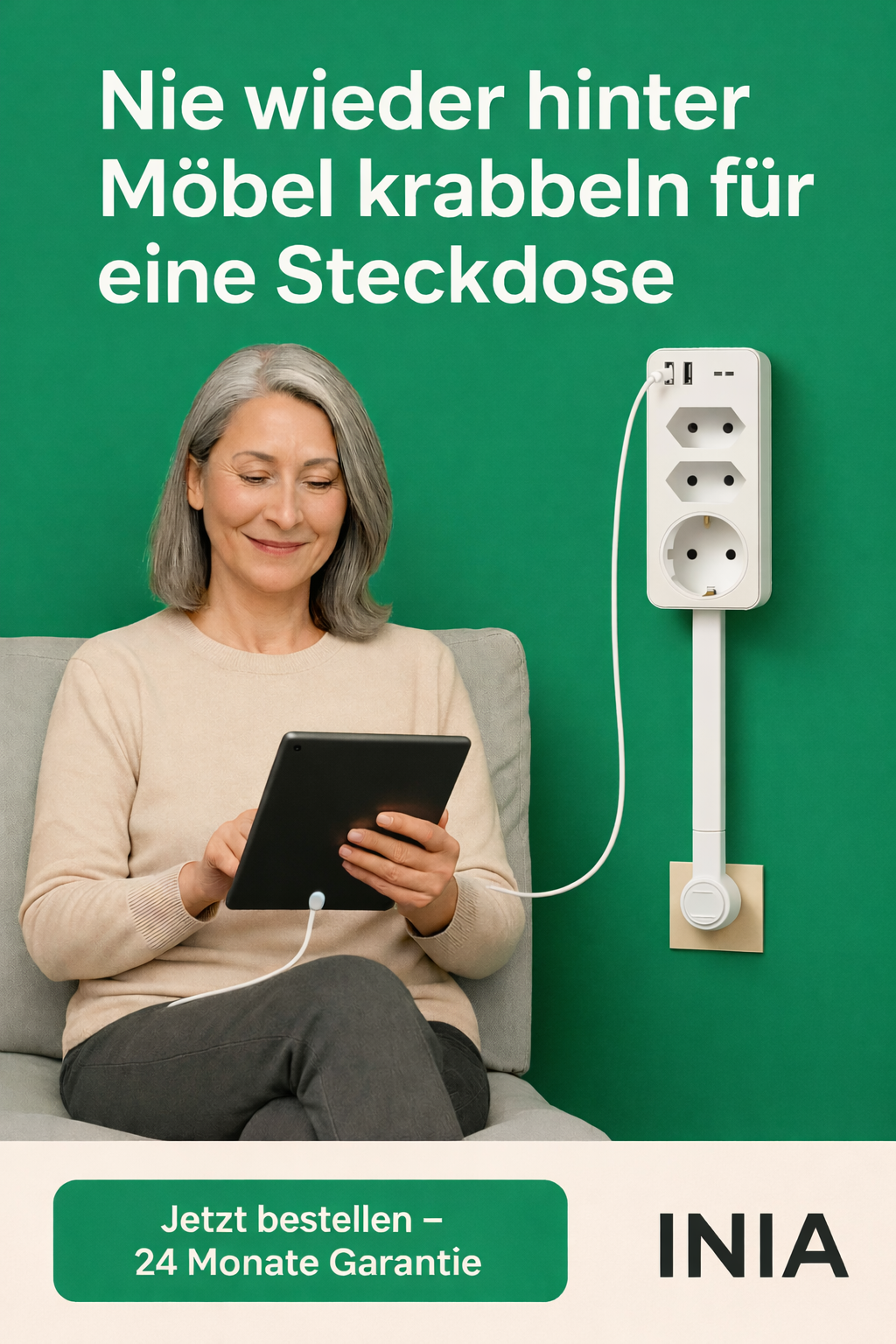Stellen Sie sich vor, Sie müssten sich nie wieder mit Kabelsalat, hinter Möbeln versteckten Ladegeräten oder fehlenden Steckdosen herumärgern, gerade wenn Sie sie brauchen. INIA® ist die ultimative Steckdosenverlängerung, die Platz schafft, die Sicherheit verbessert und den Alltag erheblich erleichtert.